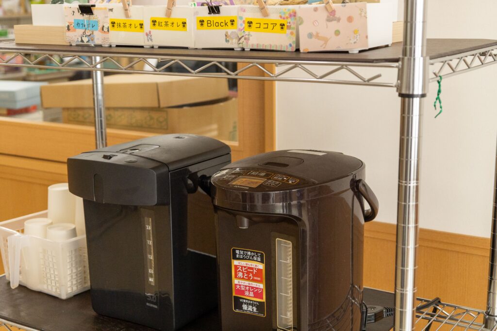 ⑥無料コーヒーコーナー…「ちょっと一息つきたい」そんな時にいつでも利用できるように、コーヒーコーナーを設置しています。ある施設では、スティック状のカフェラテなども設置しています。